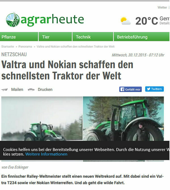 Den neuen Weltrekord für den schnellsten Traktor erreichten Nokian Tyres , führender Winterreifenspezialist der Welt, und Traktorhersteller Valtra mit ihrem gebündelten nordischen Know-how.