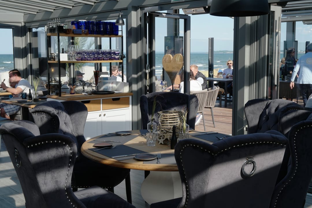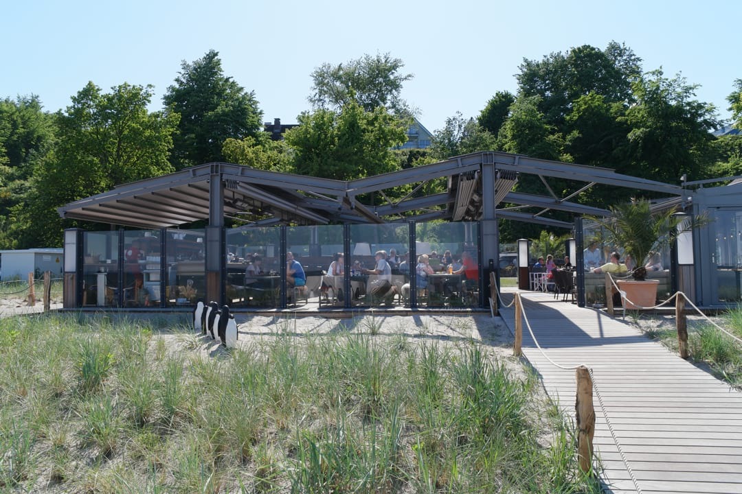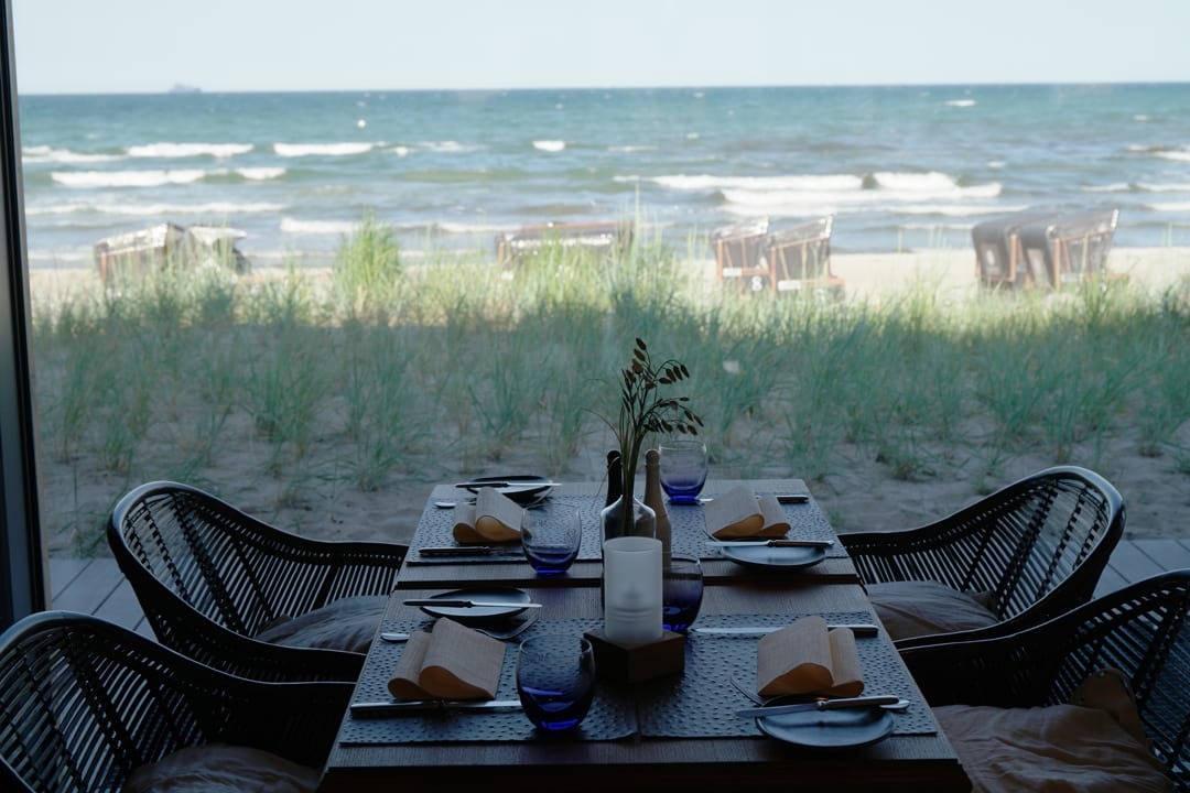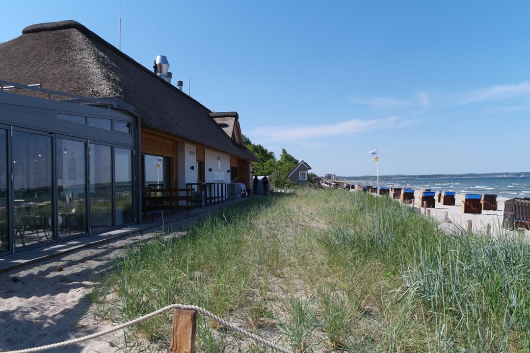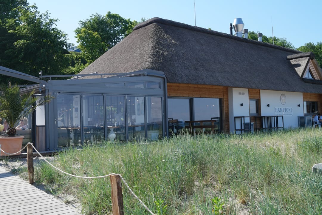 Schöner Blick aufs Meer im Hamptons Strandhaus. Restaurant, Strandbar, Café: feines Essen, gute Drinks, stilvolles Interieur in Scharbeutz. Die Hamptons in den USA sind übrigens die Strandhäuser der Milliardäre auf Long Island. Leckeres Essen und Trinken mit Seeblick – da gibt es sonst nicht viele geschmackvolle Locations an der Ostsee. Schickes reetgedecktes Gebäude, 2017 neu gebaut, direkt in den Dünen, mit freier Sicht auf den Strand.