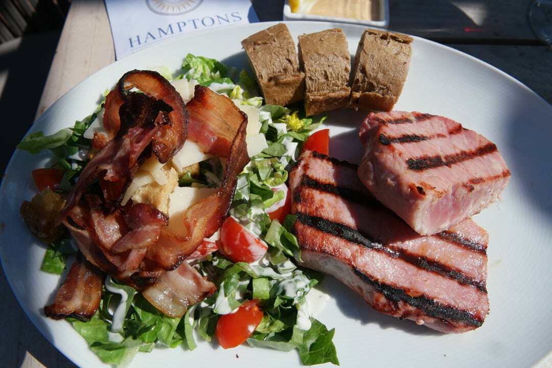 Wunderbare Thunfisch-Steaks vom Outdoor-Grill mit gesundem Salat, für faire 21 €. Dazu habe ich sogar „meinen eigenen“ Wein getrunken: Dr. Koehler, Rheinhessen, feinherb, 2017, Herr Doktor, 6,10 €. Und auch der Primitivo schmeckte mir: Fusione srl, Italien, Apulien, trocken, 2015, A Mano Primitivo, 6,10 €. Beliebt bei den Gästen war der Flammkuchen vegetarisch für 11,50 €. Ein Champagner De Saint Gall, 10,90 €, steigerte die Stimmung noch mehr.